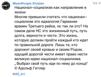 В пабликах неонацисты публикуют фашистские идеи в чистом виде с расовым превосходством, против ислама, иудаизма и христианства (себя они называют "неоязычниками"), призывами к "сафари на цыган", картинками с Гитлером, его цитатами и слоганами вроде «Львов будет националистическим или безлюдным».