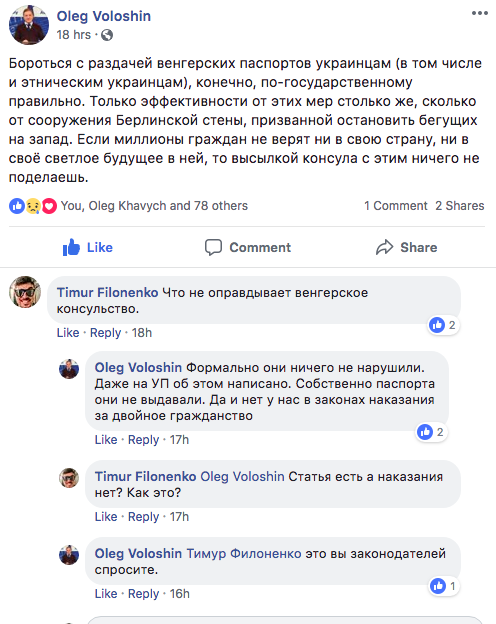 "Бороться с раздачей венгерских паспортов украинцам (в том числе и этническим украинцам), конечно, по-государственному правильно. Только эффективности от этих мер столько же, сколько от сооружения Берлинской стены, призванной остановить бегущих на запад. Если миллионы граждан не верят ни в свою страну, ни в своё светлое будущее в ней, то высылкой консула с этим ничего не поделаешь", - пишет на своей странице в Facebook бывший пресс-секретарь МИДа Олег Волошин.