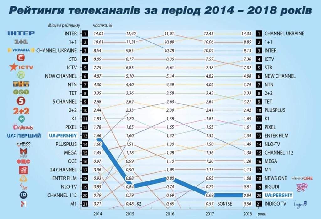 Однако завидовать оказалось особо нечему. Если в 2014 году "Первый национальный" в рейтинге телеканалов Украины держал 13 место, то за четыре года он в лице UA:Першого рухнул до 20-й отметки.