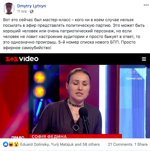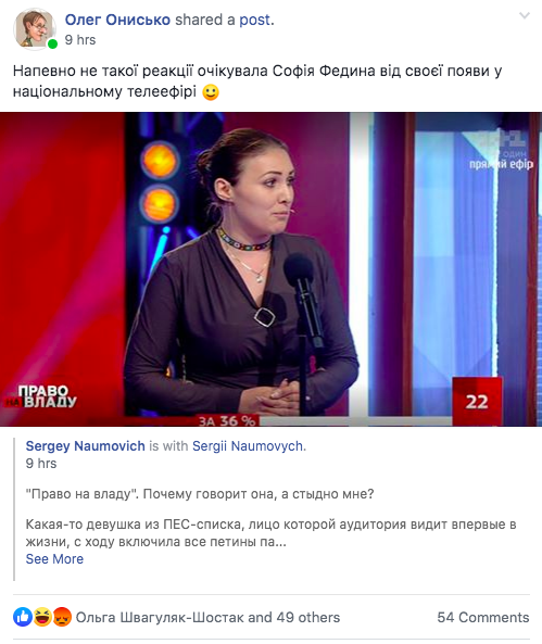 "Почему говорит она, а стыдно мне? Какая-то девушка из ПЕС-списка, лицо которой аудитория видит впервые в жизни, с ходу включила все Петины партийные методички, заученные фразы, высокомерие и даже агрессию. Потроллила аудиторию студии за смех в ее адрес, накидала всё в кучу: "Наші бійці, активісти, п‘ята колона, волонтери, Небесна сотня..." менторским тоном и жестами Муссолини)) Может она говорит правильные вещи... Но извините, этот визуально-акустический трэш утопил весь позитив её слов. Садись, два!", - написал в Facebook киевский блогер Сергей Наумович.