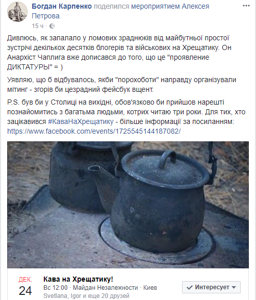 Характерно, что на митинг людей созывают, обыгрывая известный пост Мустафы Найема, с которого три года назад начинался Евромайдан. "На кофе и общение с друзьями ждем киевлян, гостей города и отдельно героев нашего времени, настоящих участников войны с восточным соседом! С собой иметь хорошее настроение, кофе в термосах, бутерброды и конфеты Рошен! Цель - показать обществу несколько иную картинку, чем еженедельные политические вакханалии и попытка штурма Октябрьского дворца!", - говорится в описании мероприятия в соцсети.