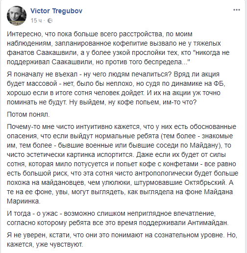 Свою трактовку причин воскресного мероприятия он описывает так: "Где появляется безудержное революционерство, там непременно последует реакция в виде недовольного охранительства. В социальных сетях и на телеканалах его давно с избытком, а тут, под влиянием событий последнего воскресенья, когда Саакашвили зачем-то направился захватывать Октябрьский дворец, сетевые охранители решили развиртуализоваться и "попить кофе на Крещатике". Кто-то и правда не прочь себя показать, других посмотреть и обменяться словом-другим с единомышленниками. А некоторые не скрывают, что акция будет носить характер демонстративной угрозы всякому политическому хулиганью: "просто военные захотели выпить кофе в кругу друзей". Будто нет военных в рядах оппонентов. И как в рядах "мишиных" есть те, кто ищет повод чего-то разбить и поджечь пущей революционности ради, так и среди "петиных" звучат голоса тех, кто не прочь "погонять тряпками" первых".