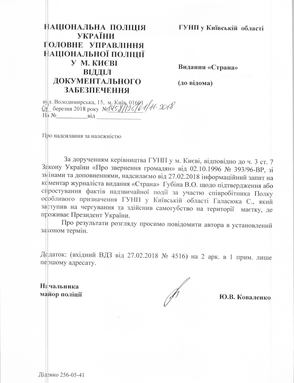 "Страна" направила запросы в полицию с целью получения официального подтверждения факта смерти Сергея Галасюка при несении службы по охране президентского дома и уточнения деталей его гибели. Просьбу автора этих строк в столичном главке перенаправили в ГУНП Киевщины.
