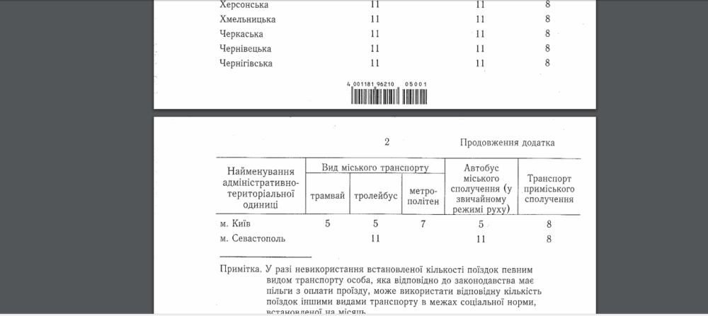 К примеру, жителям Винницкой области положено по 7 поездок на трамвае и троллейбусе, 8 – на автобусах по городским маршрутам и 8 – на пригородном транспорте (автобус, электричка). В Волынской области – по 11 поездок на троллейбусе и автобусе и 8 – на пригородном транспорте. В Днепропетровской, Харьковской областях и Киеве – по 5 поездок на троллейбусе, трамвае и автобусе, 7 – на метро и 8 – на пригородных маршрутах и т.п.