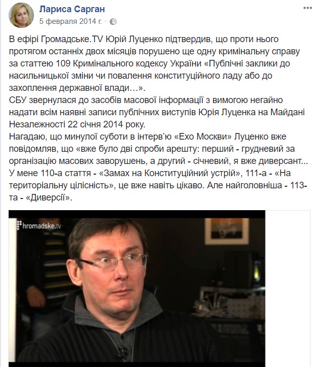 1 февраля 2014 года в интервью радиостанции "Эхо Москвы" Луценко обмолвился - в свете участия в акциях протеста на тот момент он выступал фигурантом дел, расследуемых по трем статьям Уголовного Кодекса. Среди них была названа, в том числе, и "сепаратистская" 110-ая.