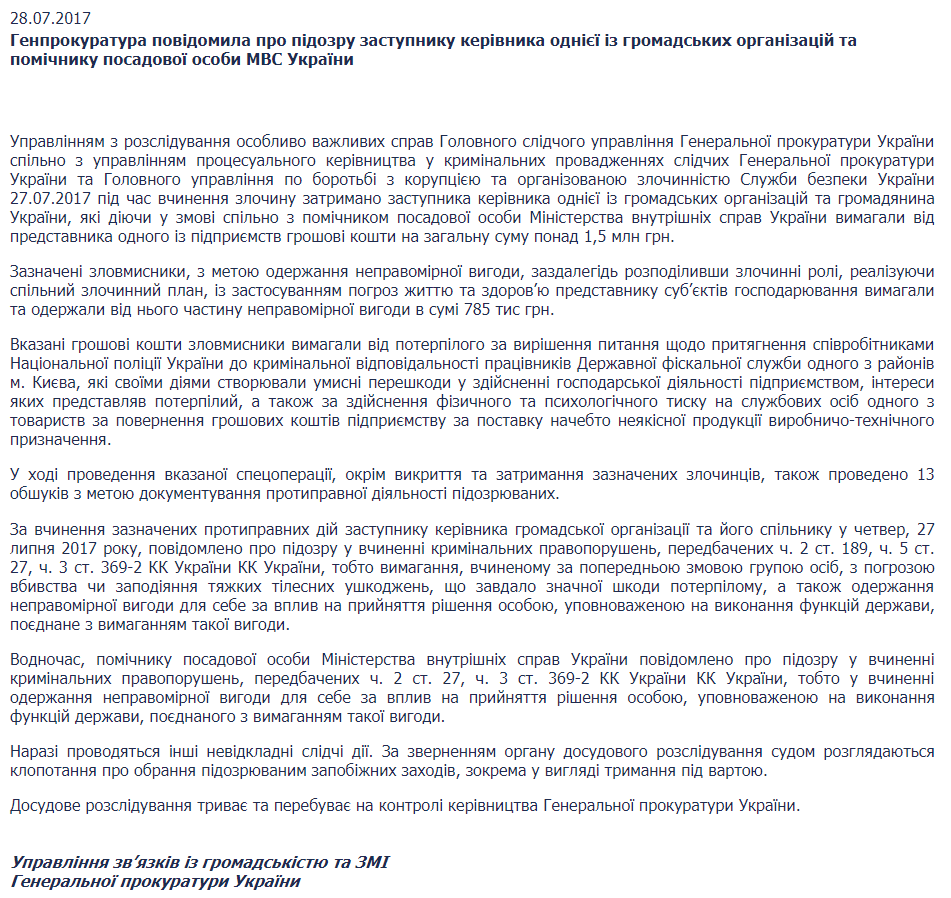 Согласно ему, изначально в ЕРДР сведения заносились с правовой квалификацией правонарушения в части вымогательства (ч.4 ст.189 Украины) и получения неправомерной выгоды (ч.4 ст.368 УК Украины). Описываемый преступный план содержал в себе три элемента.