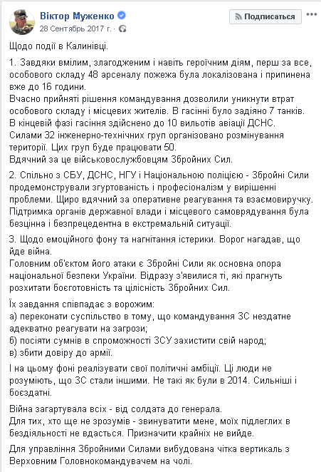 А на своей странице в Facebook Виктор Муженко сообщил: "Обвинить меня, моих подчиненных в бездействии не удастся. Назначить крайних не получится. Для управления Вооруженными Силами выстроена четкая вертикаль с Верховным Главнокомандующим во главе":