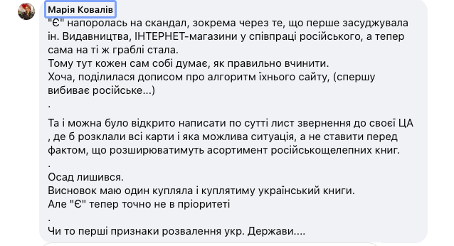 Ирония в том, что “Книгарня Є” публично критиковала конкурентов, к примеру, магазин Yakaboo, за то, что они торгуют российскими книгами. А теперь же “Книгарня Є” и сама начинает продавать больше русскоязычной продукции.