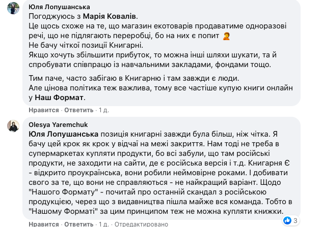Немало покупателей сети негативно восприняли этот шаг, а некоторые даже объявили сети бойкот: продажу русских книг в “Книгарня Є” назвали "зрадой" и отказались в дальнейшем покупать у них литературу.