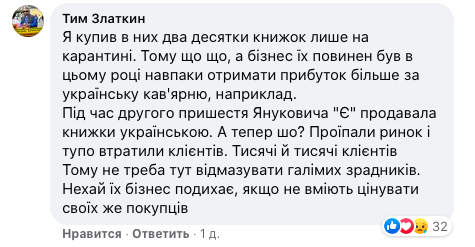 “Сотни моих френдов написали оскорбительные и отчаянные комментарии о книжном магазине, который решил продавать российские книги. Меня это решение тоже разочаровало. Но по другим причинам. 80% украинцев за год не купили ни одной книги, — пишет Кипиани на своей странице в фейсбуке. — В этой ситуации бизнес, который сам себя ограничил украиноязычной аудиторией априори проигрывает. Потому что есть такая наука арифметика. «Да мало нас». И этот момент непременно должен был наступить — либо закрыться, либо измениться. Это очень обидно. Но коллективное самоубийство с пожеланием сети умереть и обещаниями не покупать там ничего просто приблизят ее смерть.