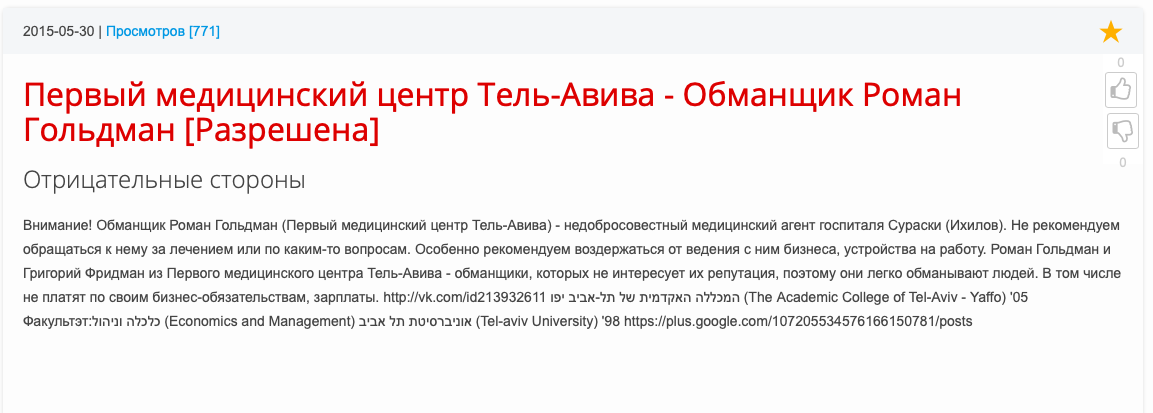 "Роман Гольдман и Григорий Фридман из Первого медицинского центра Тель-Авива - обманщики, которых не интересует их репутация, поэтому они легко обманывают людей", - утверждает пользователь, оставивший этот отзыв в интернете.