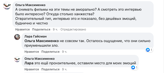 "А снимать фильмы на эти темы не аморально? А смотреть это интервью было интересно? Откуда столько ханжества? Отвратительный тип, интервью это и показало, без дешевых эмоций, буднично и честно", – пишет Ольга Маскименко под обсуждением интервью Собчак.