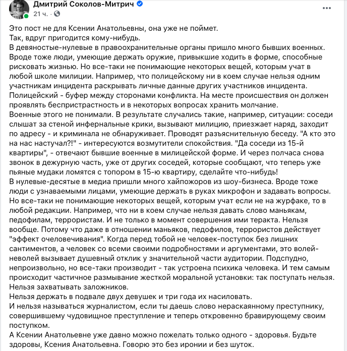 "И тем самым происходит частичное размывание жесткой моральной установки: так поступать нельзя. Нельзя захватывать заложников. Нельзя держать в подвале двух девушек и три года их насиловать. И нельзя называться журналистом, если ты даешь слово нераскаянному преступнику, совершившему чудовищное преступление и теперь откровенно бравирующему своим поступком. А Ксении Анатольевне уже давно можно пожелать только одного – здоровья. Будьте здоровы, Ксения Анатольевна. Говорю это без иронии и без шуток", – заявил Дмитрий Соколов-Митрич.
