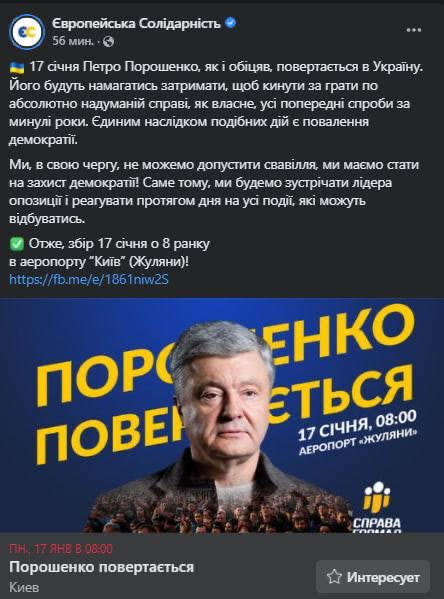 На страницах партячеек и фракций в соцсетях появились объявления вроде опубликованного фракцией ЕС во Львовском облсовете: “17 января лидер оппозиции Петр Порошенко возвращается в Украину! И мы идем его встречать. Речь идет не только о защите Порошенко, но и о защите демократии в Украине! Партия “Европейская солидарность” готова! Порох есть, дадим огня!”.