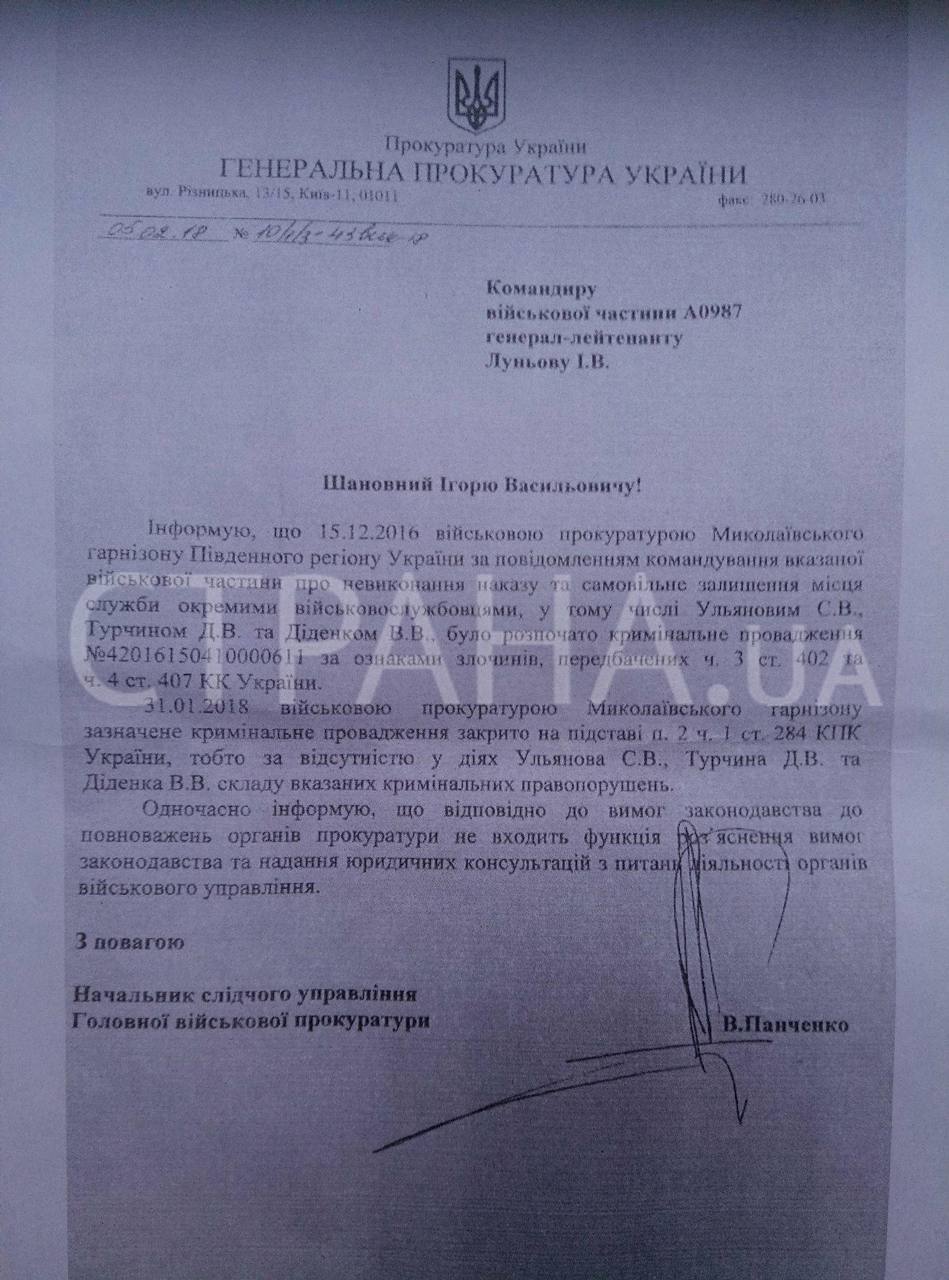 Документ, подтверждающий, что с Сергея Ульянова сняты обвинения в неподчинении и самовольном отлучении из части. Фото: Страна