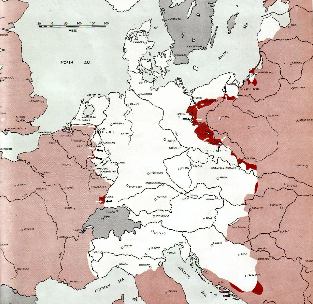 К середине февраля Красная армия почти дошла до Берлина, но вся Германия западнее и южнее оставалась под контролем нацистов. Карта по состоянию на 15 февраля 1945 года