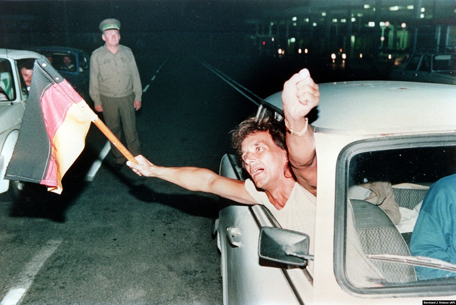 Сентябрь 1989. Восточный немец пересекает венгерско-австрийскую границу с флагом ФРГ