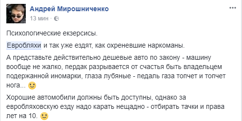 Андрей Мирошниченко считает: "Евробляхи и так уже ездят, как охреневшие наркоманы.