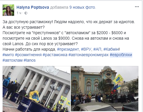 Пользователь Галина Попцова согласна с этой точкой зрения. "За доступную растаможку! Людям надоело, что их держат за идиотов. А вас все устраивает?  Посмотрите на "преступников" с "автохламом" за $2000 - $6000 и посмотрите на свой Lanos за $9000. Снова на автохлам и снова на свой Lanos. До сих пор все устраивает? Начни работать для народа, #президент, #ВРУ, #АП, #Кабмін! "