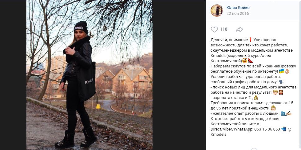 Как оказалось, Юля работала и до этого. В модельном агентстве KModels она была на административной должности и даже приглашала туда сотрудников. Объявление мы нашли у нее на страничке в соцсети.