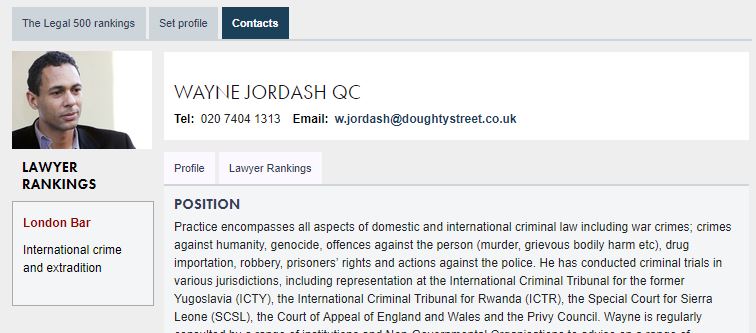 Вэйн Джордаш в 2017 году был признан одним из ведущих юристов по международному криминальному праву, сообщается на сайте The Legal 500.