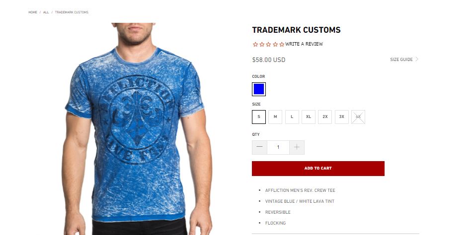 Это вещь американского бренда Affliction Clothing. Продукция Affliction включает футболки, поло, термальную одежду и толстовки. Как указано на официальном сайте, первоначально Affliction задумывался исключительно как бренд для татуировщиков, рокеров и рок-музыкантов. Однако позднее, получив широкий отклик среди голливудских знаменитостей, в том числе среди известных актеров и музыкантов.