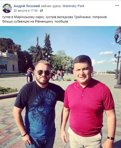 "Гулял в Мариинском парке. Встретил случайно Гройсмана. Попросил большую субвенцию (вид денежного пособия местным органам власти со стороны государства, выделяемого на определённый срок на конкретные цели - Прим.Ред.) для Ровенщины. Побещал", - написал народный депутат под фото. "Страна" же в свою очередь отметила брендовую футболку, в которой разгуливал Лозовой.