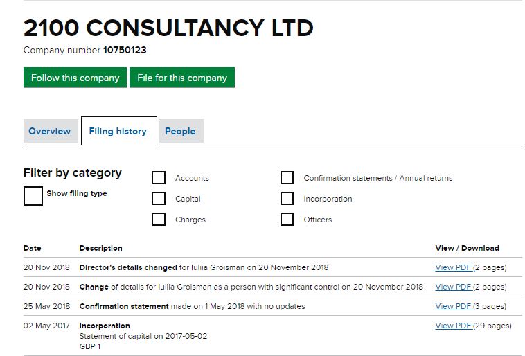 Действительно, ранее сообщали о том, что Юлия Гройсман в мае 2017 года зарегистрировала в Лондоне собственную компанию под названием 2100 consultancy ltd с уставным капиталом в размере 1 фунт стерлингов. Дочь Гройсмана в 25 лет стала директором и единственным владельцем этой фирмы.