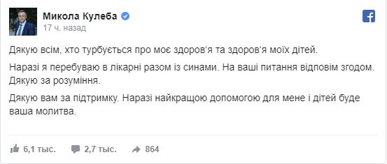 "Спасибо всем, кто переживает о моем здоровье и здоровье моих детей. Сейчас я нахожусь в больнице вместе с сыновьями. На ваши вопросы я позже отвечу. Спасибо за понимание. Спасибо вам за поддержку. Сейчас лучшей помощью будет для меня и детей - ваша молитва", - попросил Кулеба.