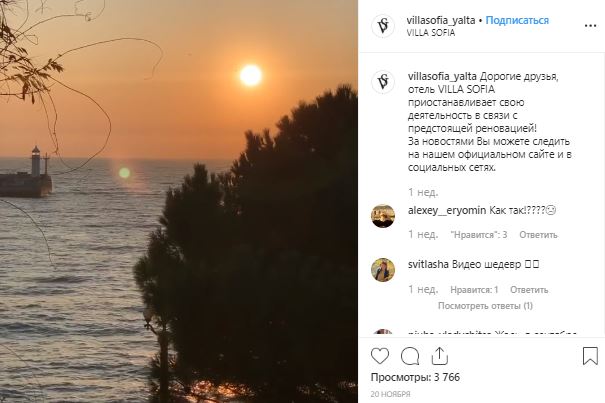 "Дороги друзья, отель VILLA SOFIA приостанавливает свою деятельность в связи с предстоящей реновацией! за новостями Вы можете следить на нашем официальном сайте и в социальных сетях", - сказано в посте.