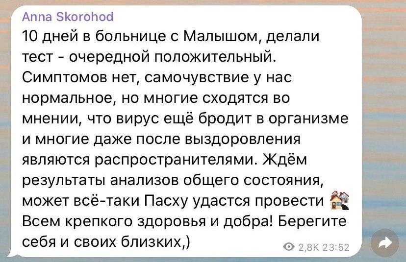 "Симптомов нет, самочувствие у нас нормальное, но многие сходятся во мнении, что вирус еще бродит в организме и многие даже после выздоровления являются распространителями. Ждем результаты анализов общего состояния, может все-таки Пасху удастся провести дома. Всем крепкого здоровья и добра! Берегите себя и своих близких", – отмечает Скороход.