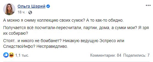 "А можно я сниму коллекцию своих сумок? А то как-то обидно. Получается все посчитали-пересчитали, партии, дома, а сумки мои? Я зря их собираю? Стоят.. и никого не бомбанет? Никакую ведущую "Эспресо" или "СлидствоИнфо"? Несправедливо", – написала жена Шария.