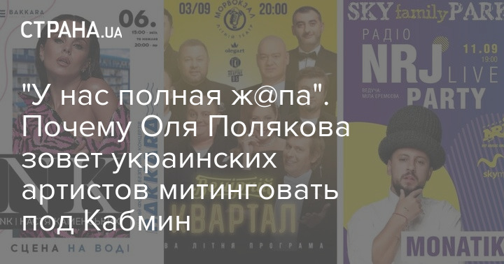 Из-за этого у нее сорвалось 4 выступления в сентябре, а большое шоу 26 октября под угрозой. Вчера у нее отменился концерт на стадионе в Белой Церкви запланированный на 6 сентября, где продали несколько тысяч билетов. "Теперь я не буду молчать! Я не понимаю, почему одним можно проводить концерты, а другим нельзя?! Все вокруг работает, а у нас полная ж@па" - возмущается Оля Полякова.