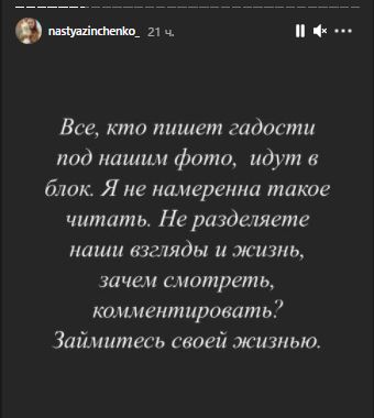 Кстати, Зинченко очень чувствительна к тем сообщениям, которые оставляют у нее на страницах. На все позитивные она отвечает, а вот если идет критика или неприятные высказывания, то блокирует пользователей и советует "заняться своей жизнью".