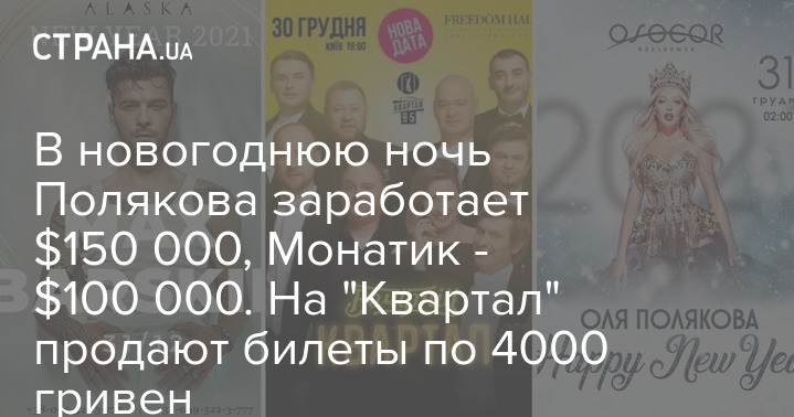 "Пока что запрос в новогоднюю ночь есть и на Диму Монатика (MONATIK). Запрос из Киева. Люди соскучились по выступлениям любимого артиста и очень хотят в Новый год вступить с дорогой сердцу музыкой. И кто, если не Монатик, который в этом году просто давал смысл проснуться всем и начать работать, что-то делать, выпускать клипы, записывать дуэты, создал мюзикл. Но ситуация в современном мире в связи с пандемией может поменяться в любой момент. Команда артиста планирует встретить Новый год на сцене. Более того, на выступление пригласили и подопечных продюсерского лейбла Димы - Лиду Ли и Нино Басилая с их сольными песнями и программами", - говорят организаторы вечеринок и добавляют, что выступление трех артистов в новогоднюю ночь будет стоить около $100 000.