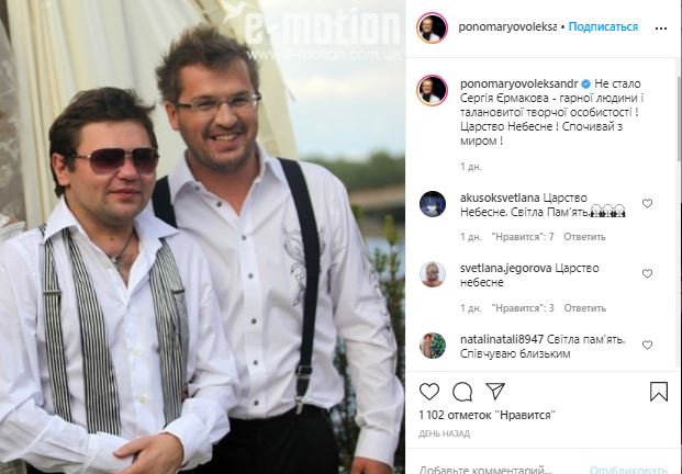 "Не стало Сергея Ермакова - хорошего человека и талантливой творческой личности! Царство Небесное! Покойся с миром", - написал певец Александр Пономарев и выложил совместное фото с покойным.