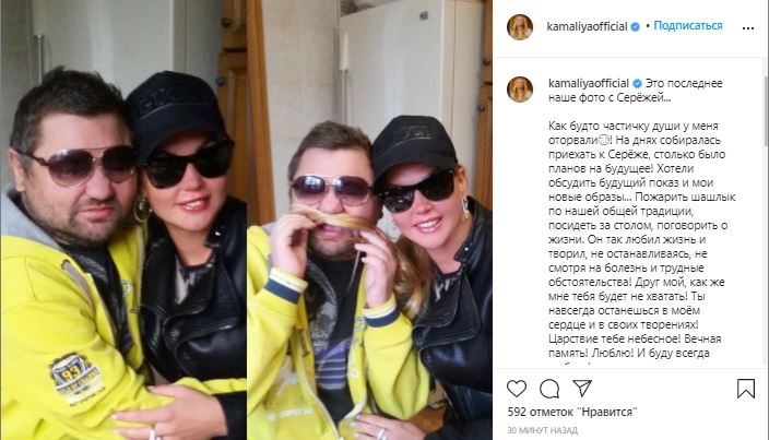 Певица Камалия тоже присоединилась к соболезнованиям: "Сергей, дорогой, как же так? Ты навсегда останешься жить в твоих шедевральных творениях. Царство небесное, друг".