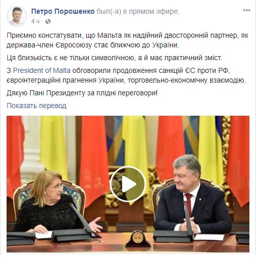 "Приятно констатировать, что Мальта как надежный двусторонний партнер, как государство-член Евросоюза становится ближе к Украине", – подчеркнул Порошенко. По его словам, чрезвычайно важно осуждение Мальтой нарушений прав человека в оккупированном Крыму. Президент также сообщил, что между Украиной и Мальтой вскоре откроется прямое авиасообщение.