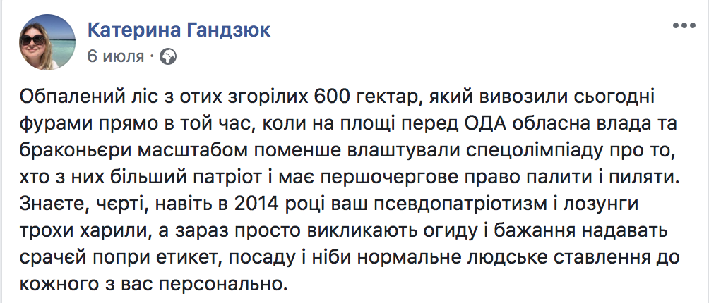 К слову, то, что "мусор" с лесных пожарищ вывозится и продается как промышленный лес, Екатерина Гандзюк заявила на своей странице ФБ еще 6 июля 2018 года.