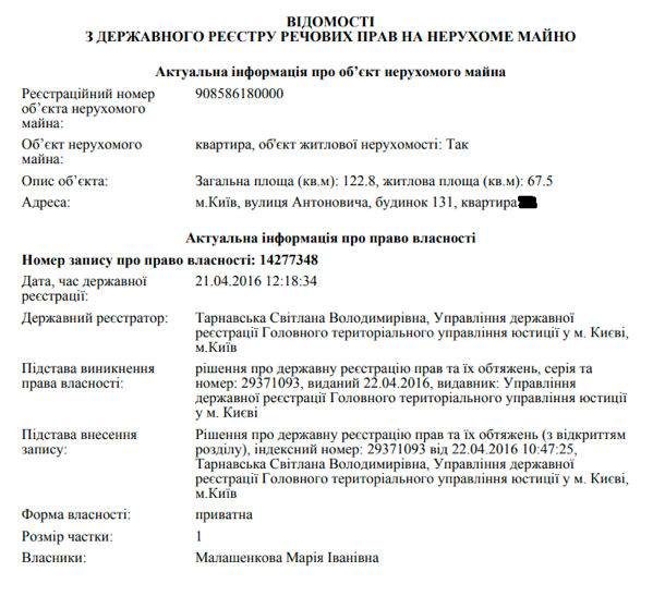 Мария Ивановна Малашенкова вместе Татьяной Малашенковой и другими членами семьи являются совладельцами еще одной киевской квартиры, которую последняя указывала в своих декларациях: