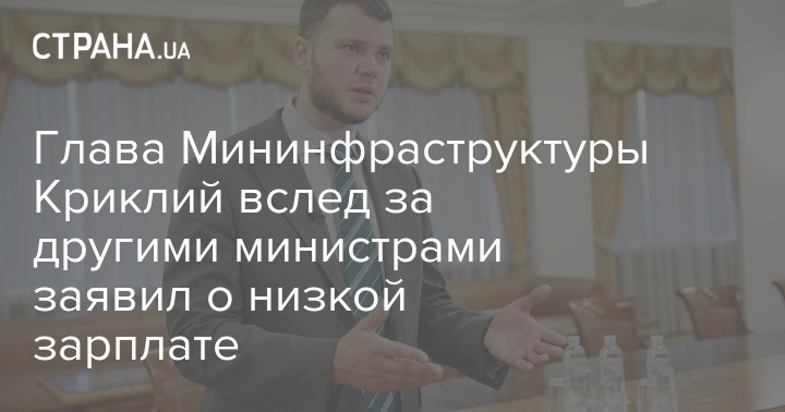 Министр инфраструктуры Украины Владислав Криклий заявил, что его зарплата в размере около 40 000 грн является несправедливой на фоне других зарплатных скандалов в Кабмине. Об этом он рассказал в интервью Украинскому Радио.