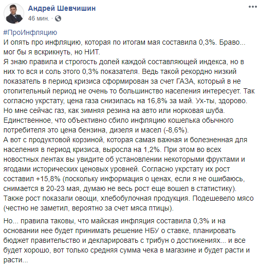 Но... правила таковы, что майская инфляция составила 0,3% и на основании нее будет принимать решение НБУ о ставке, планировать бюджет правительство и декларировать с трибун о достижениях... и все будет хорошо, вот только средняя сумма чека в магазине и будет расти и расти...", - написал экономист.