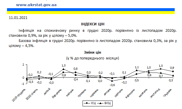 В 2020 году рост потребительских цен в Украине ускорился до 5% с 4,1% в 2019 году. В декабре прошлого года инфляция снизилась до 0,9% с 1,3% в ноябре и 1% в октябре.