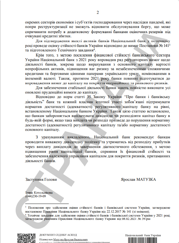 Какое-то время это были лишь слухи, а сейчас появилось внутреннее письмо регулятора №20-0006/24052, в котором он настоятельно рекомендует банкам не выплачивать дивиденды акционерам до завершения проверок НБУ.