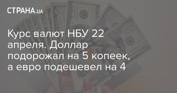 Национальный банк Украины в четверг, 22 апреля, установил официальный курс гривны по отношению к иностранным валютам. По сравнению с предыдущим рабочим днем доллар вырос в цене, а евро подешевел.