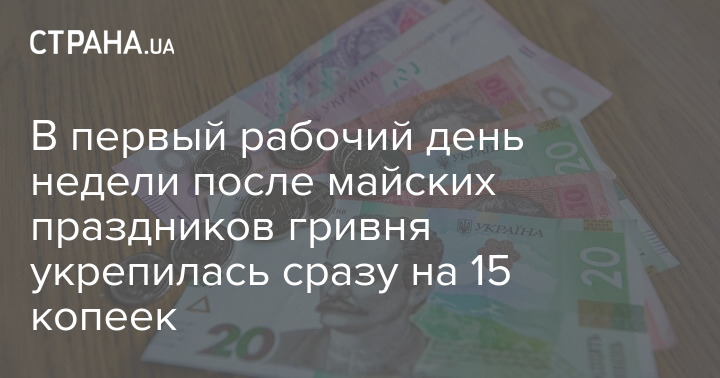 В первый рабочий день недели после майских праздников гривня укрепилась сразу на 15 копеек