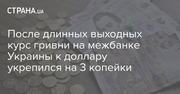 Курс гривни на межбанковском валютном рынке после снижения в пятницу на 3 копейки в понедельник укрепился на 3 копейки и составил 27,21 гривен за 1 доллар.