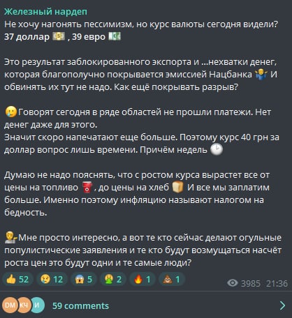 "Говорят, сегодня в ряде областей не прошли платежи. Нет денег даже для этого. Значит скоро напечатают еще больше. Поэтому курс 40 грн за доллар вопрос лишь времени. Причем недель", - пишет он.