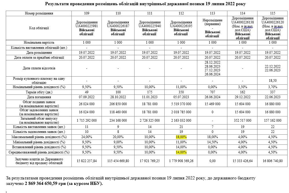 Сегодня, 19 июля, Минфин разместил один из выпусков военных облигаций под 14% годовых. Это 12-месячные облигации, с погашением 5 июля 2023 года, которых чиновники сегодня продали на 1,8 млрд грн.
