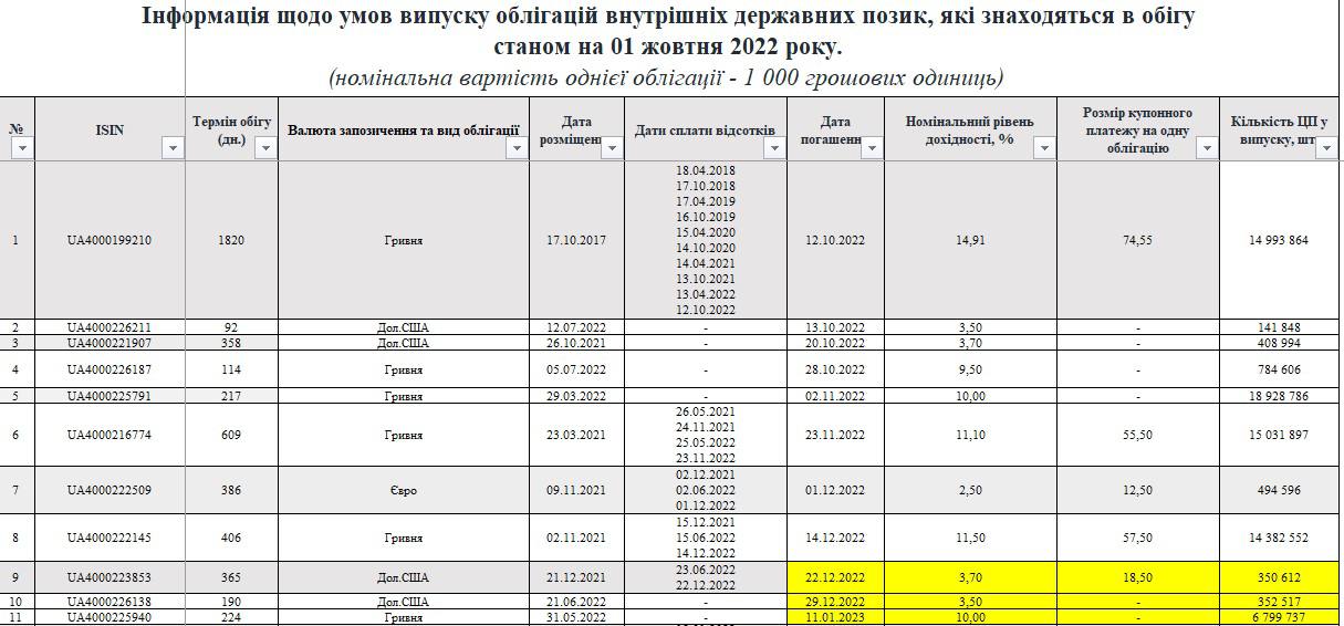Средства потребуются немалые, как до конца 2022 года, так и в начале 2023-го. Причем, речь не только о покрытии текущих бюджетных потребностей страны, но и о погашении старых выпусков ОВГЗ. Его объем превысит вышеупомянутые 15 млрд грн.